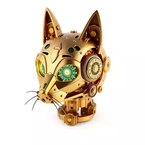 Presenting a masterfully crafted 3D model of a steampunk-inspired robotic cat head, designed with an exquisite blend of vintage industrial aesthetics and feline elegance. This model features a striking golden metallic finish, meticulously detailed with intricate gears, visible clockwork mechanisms, and various bolts and rivets that contribute to its authentic retro-futuristic charm. Its luminous eyes are cleverly designed as detailed clock faces, adding a unique and captivating element to its expression. Every component, from the articulated ears to the delicate whiskers, showcases precision engineering and a fantastical, imaginative style. This versatile asset is ideal for a wide array of digital projects, including enhancing game environments as a distinctive prop or character element, creating immersive AR/VR experiences, or serving as a focal point in cinematic animations and digital art pieces. It is also perfect for product visualization or as a unique collectible in a virtual showroom. The model is provided in multiple industry-standard formats such as GLB, OBJ, FBX, STL, DAE, and USD, ensuring broad compatibility across various platforms and software. It boasts clean, efficient topology, making it optimized for both high-fidelity renders and real-time applications, ensuring smooth performance without compromising visual integrity. Fully UV unwrapped, it is ready for easy texture application and customization, and includes PBR textures for realistic material representation. This model is also a strong candidate for 3D printing enthusiasts seeking an impressive physical creation.