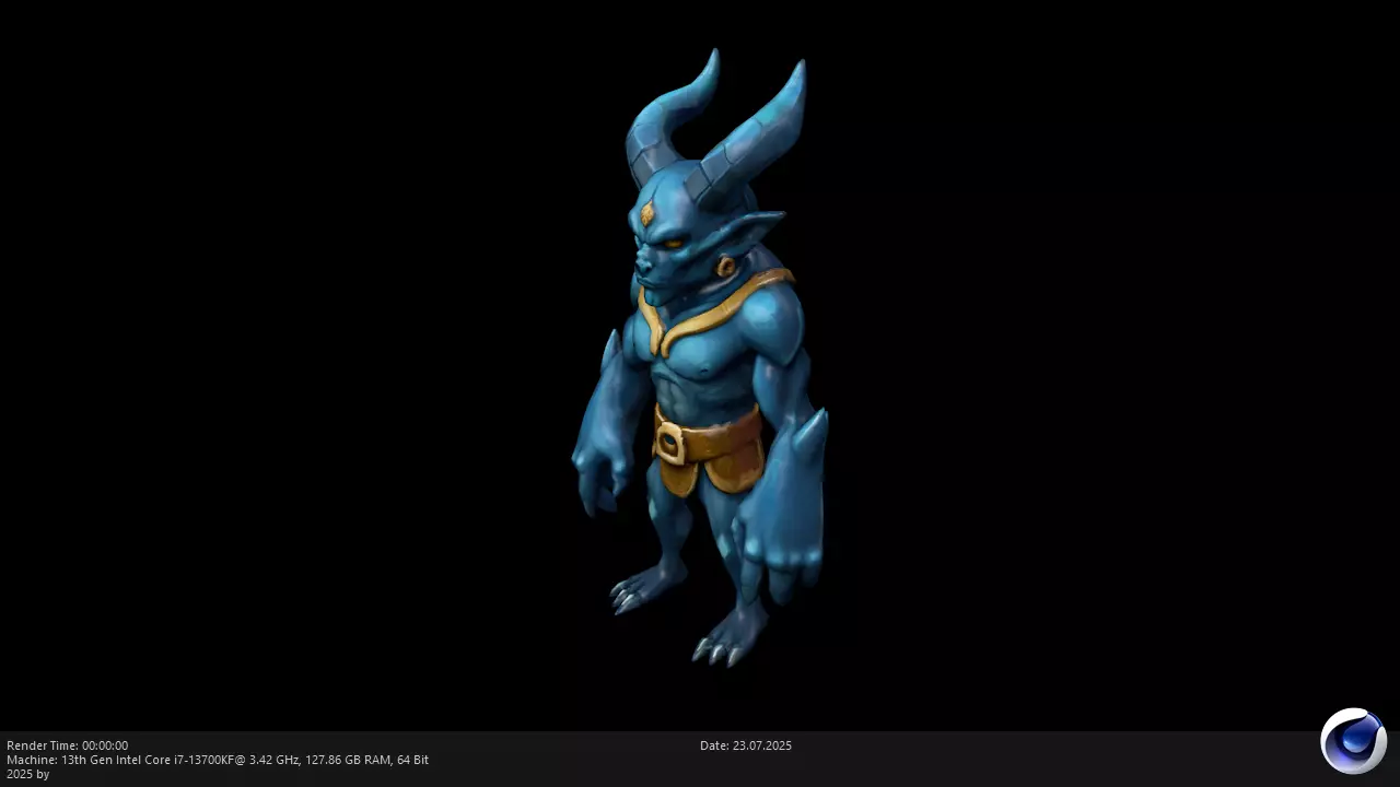 This is a stylized 3D model of a blue demon warrior, designed for use in fantasy and action game settings. With large curved horns, glowing eyes, and muscular anatomy, the character has a powerful and intimidating presence. Ideal for use as an enemy, boss, or summoned creature in RPGs, strategy games, or cinematic animations.