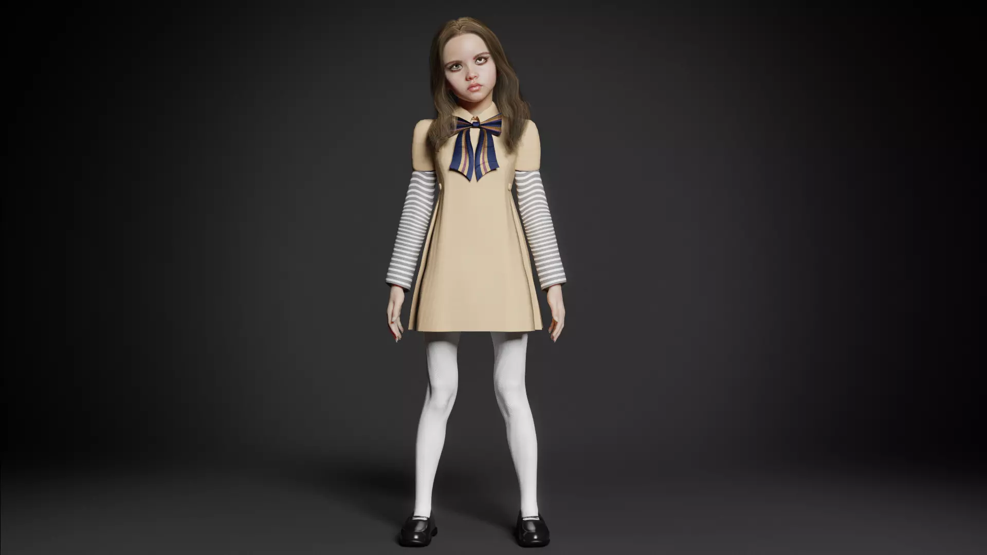 M3GAN V.1 the robot doll (fim-inspired) - a highly detailed Fully rigged and optimized 3D model for real-time use, it's perfect for games, AR/VR, animation, or film. Features realistic textures, clean topology, and expressive rig controls — ready for any use in any project... Modelled in Blender, Fully rigged with SSS subsurface scattering.
