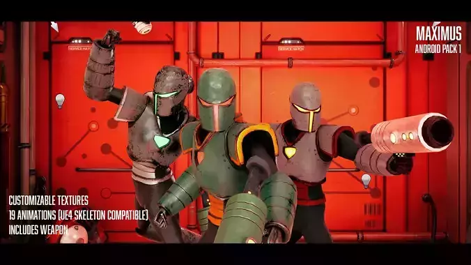 ALSO PART OF THE FULL METAL MEGA PACKRobot Character with parameter-based masked materials making infinite possible color schemes, 19 animations FBX included for easy modification and tweakingRIGGED TO UE4 SKELETONANIMATIONS ARE COMPATIBLE WITH MOST UE4 CHARACTERSAnimation Showcase - Youtube VideoIncludes Overview mapenvironment not included (Scifi Hallway)12 movement animations7 Combat animationsJoin our Discord - https://discord.gg/qsGgVmCGladiator Androids Pack $29.99Radical Robots Pack $29.99Drone Triple Pack $29.99
