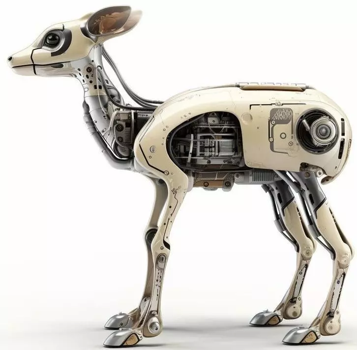 Ultra-realistic 3D model of a mechanical deer, designed as a sophisticated and intricate digital asset that blends advanced technology with organic form. The figure features a sleek, streamlined body rendered in smooth, glossy beige material—resembling polished plastic or composite resin—with contrasting silver mechanical components that highlight its robotic nature. Its head is elongated and angular, with glowing blue eyes that add a touch of life and intelligence to its expression.