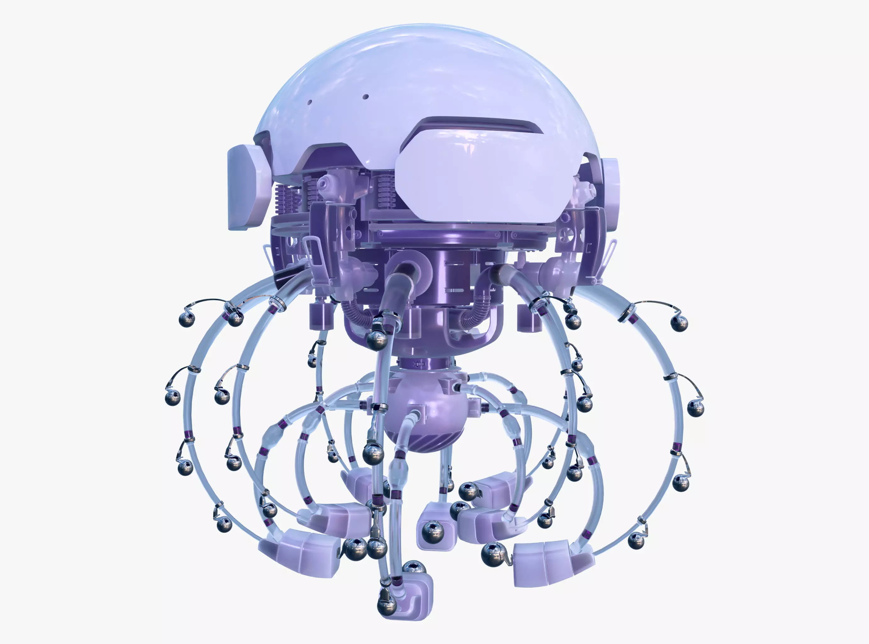 Futuristic jellyfish robot with a smooth dome-shaped upper body and a complex system of flexible transparent tube-tentacles arranged in a circle. Lower part includes numerous movable elements with metal joints and modular blocks, forming a system for distributing and processing liquids. Various mechanical mounts and connections are also clearly visible, emphasizing the high-tech nature of this robot.