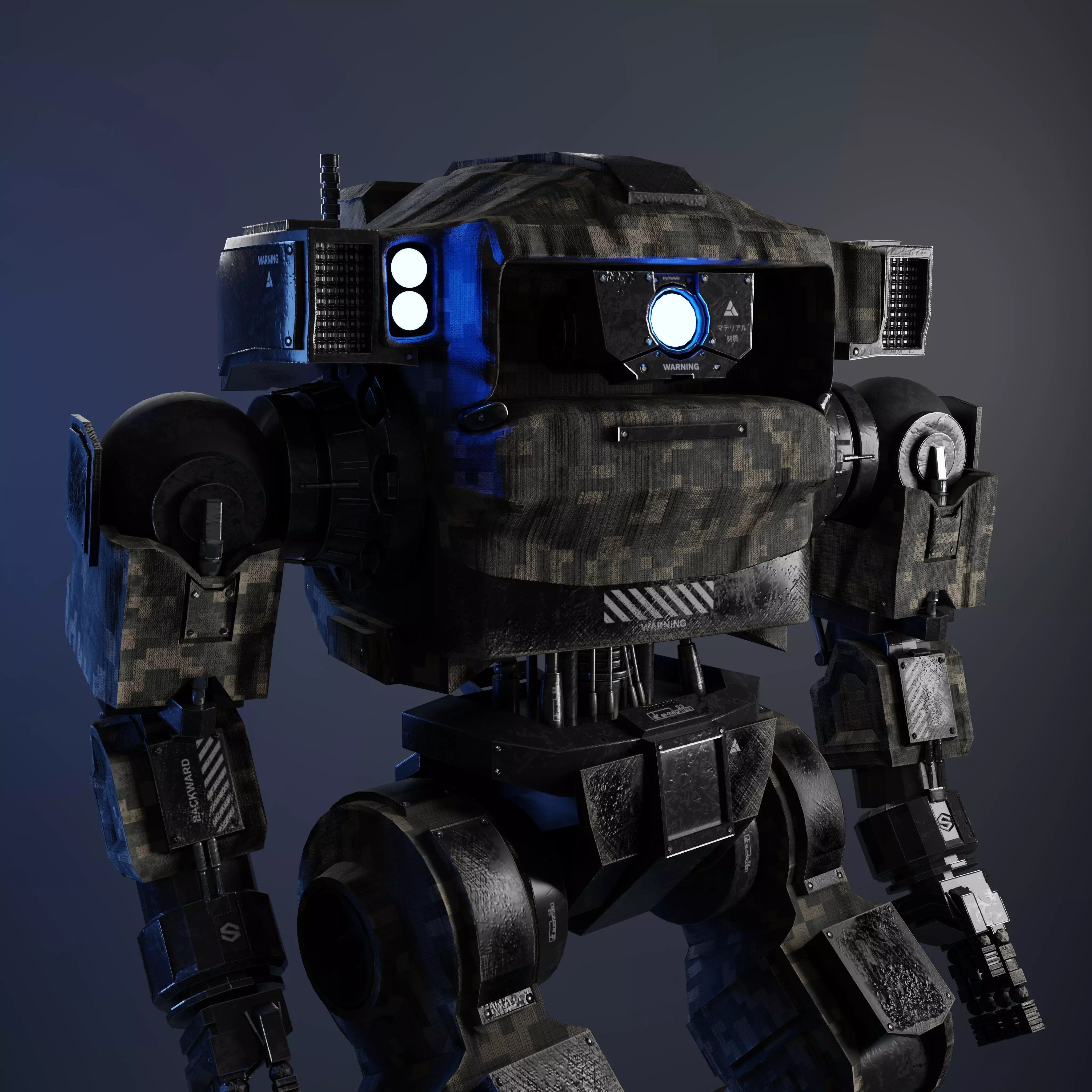 A 3D model of a military mech robot. No rig at this point, two sets of 4k textures. High resolution, high realism, low poly model