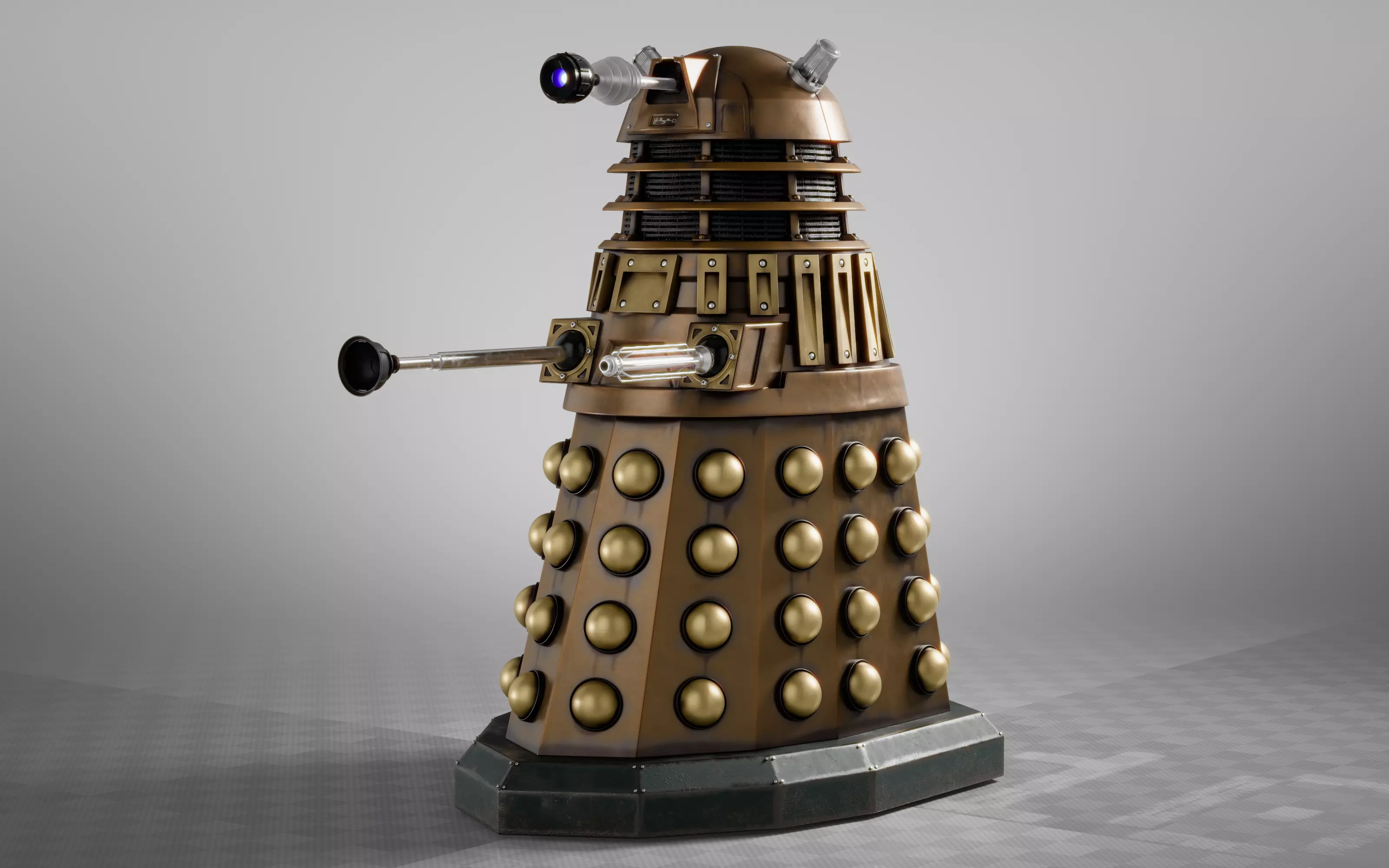 A 3D Model of a New Series Dalek from Doctor Who. This is version 15, my newest model from a couple of years ago.This dalek is based off of the original 3 props modeled for The Parting of the Ways (2005), after the changes to the colour scheme but before they stopped using the oil stains.