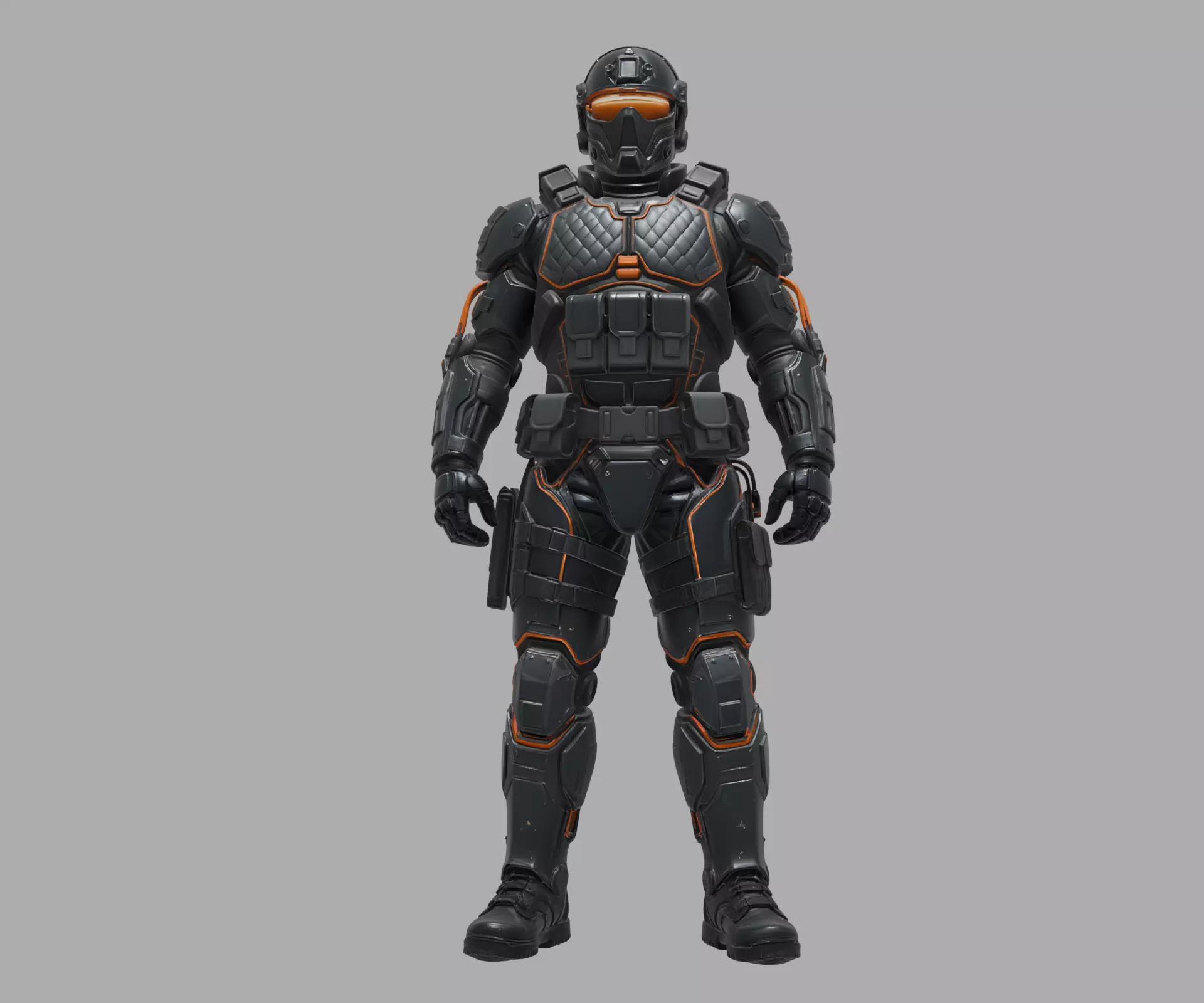 This is an Orange Accent Tactical Combat Armor, a high-detail 3D asset optimized for animation production, digital art creation, high-end collectible figure design, and sci-fi themed brand visual content development. This futuristic combat armor features a durable matte gray finish, striking glowing orange circuit accents, a fully enclosed tactical helmet with an orange-tinted visor, and precision-engineered segmented plating with integrated pouches. Its imposing, combat-ready silhouette balances rugged tactical functionality with a sleek, futuristic design, making it ideal for sci-fi digital projects, premium collectible design, and high-quality character art creation.