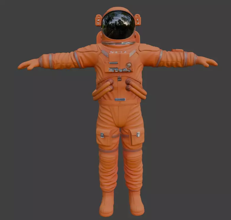 Highly detailed 3D model of a modern orange extravehicular activity (EVA) spacesuit worn by astronauts during spacewalks. Features realistic fabric folds, life support backpack (PLSS), helmet with reflective visor, gloves, hoses, connectors, pockets and authentic NASA-style details. Perfect for space station scenes, moon missions, Mars renders, sci-fi projects, VR and high-end visualizations. Clean topology, non-overlapping UVs, PBR materials ready for any render engine.
