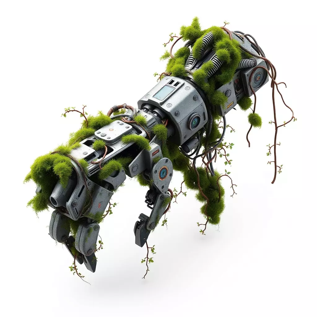 This highly detailed 3D model presents a futuristic robotic arm, intricately designed with exposed mechanisms and a weathered, metallic finish. What makes this asset unique is its striking contrast with nature; it is heavily overgrown with lush green moss and delicate winding vines, suggesting a long period of abandonment or a post-apocalyptic setting where nature reclaims technology. This model is perfect for enhancing various digital environments, including immersive game development scenarios, realistic architectural visualizations, and compelling augmented reality (AR) or virtual reality (VR) experiences. It also serves as an excellent foundation for digital art compositions, cinematic renders, or animation projects requiring a blend of sci-fi and natural elements. The asset is optimized with clean topology and is likely UV unwrapped, allowing for seamless integration and customization. It comes with high-quality PBR (Physically Based Rendering) textures, ensuring realistic material properties and lighting interactions, making it suitable for both real-time applications and high-fidelity static renders. Potential file formats include GLB, OBJ, STL, ABC, DAE, FBX, USD, and PLY, providing broad compatibility across different 3D software and engines. Its detailed design and unique aesthetic make it a standout prop for any project exploring themes of decay, resilience, or the convergence of technology and nature.