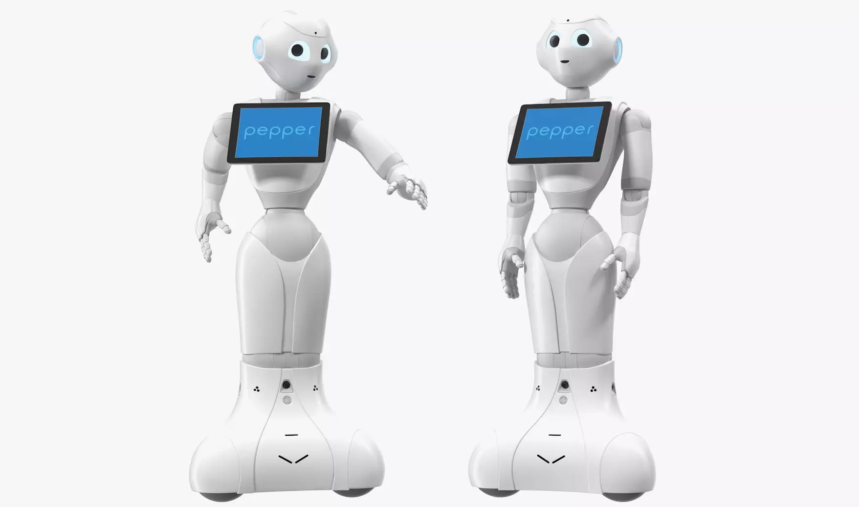 Pepper Robot home robotics humanoid with head, body, arms, legs, and information display. Futuristic social humanoid robot with the ability to recognize human faces and emotions. Information Display Pepper Robot designed and manufactured by French robotics firm SoftBank Robotics (formerly Aldebaran Robotics) for Japanese telecom multinational conglomerate holding company SoftBank Group Corp.For humanoid shape robots, kid robotics leisure, information robotics devices, robotics industry technologies, high tech concepts, and computer games design.