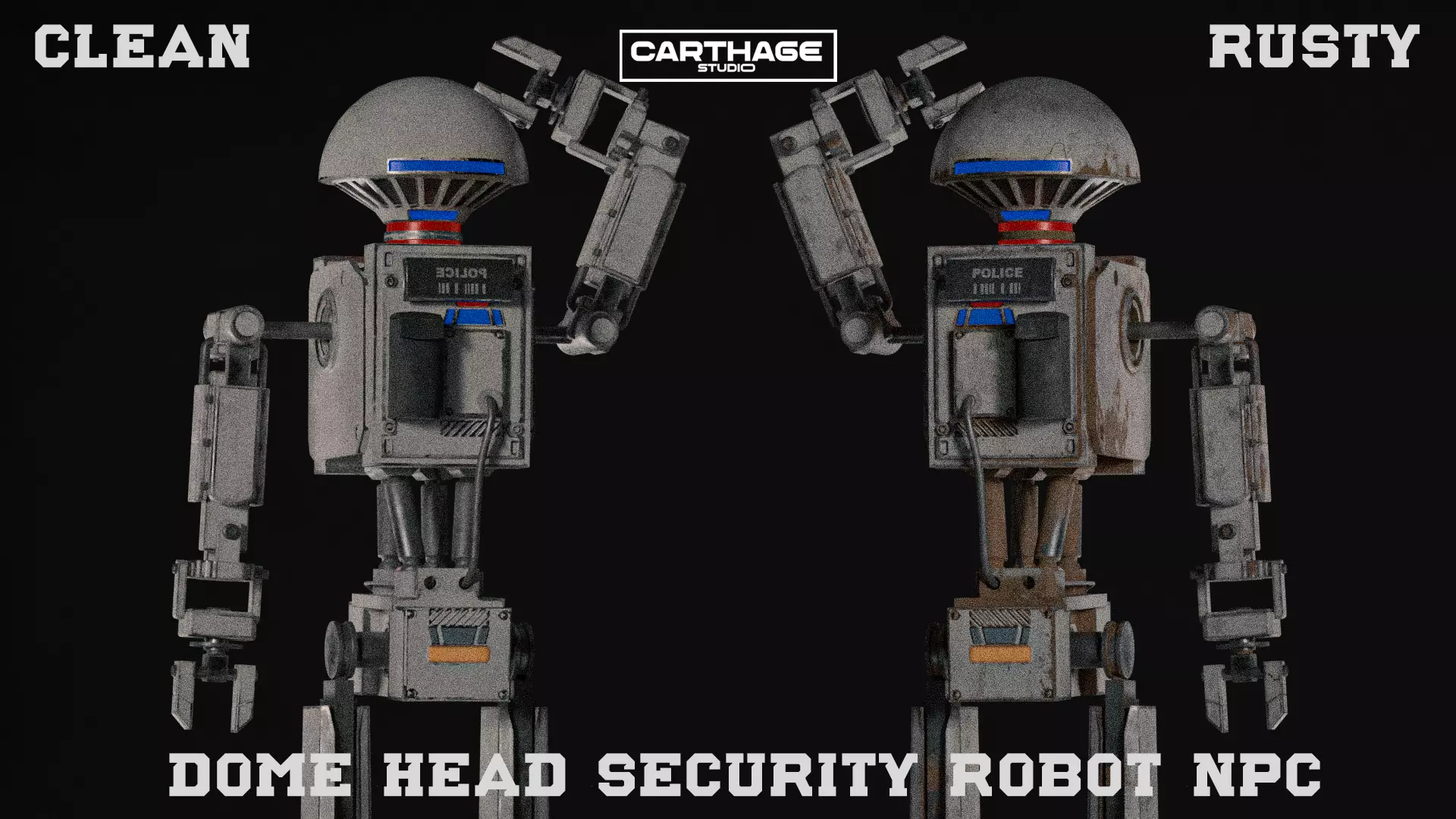 The dome‑head police robot NPC brings a law‑enforcement aesthetic to your game or animation. It features a rounded dome head with an integrated light bar and a front panel with police markings. A humanoid‑style rig allows full articulation of the head, arms and legs. Two PBR texture variations are included: clean (polished surfaces) and rusty (weathered and chipped). Textures use BaseColor, Normal, Roughness and Metallic maps. Meshes are organized into separate parts for easy material adjustments. The asset is supplied without animations, leaving you free to apply your own. Use this robot in futuristic city scenes or security checkpoints. For all five designs, look for the Security Robots Bundle; for a complete NPC roster, the Full NPC Pack will be available.