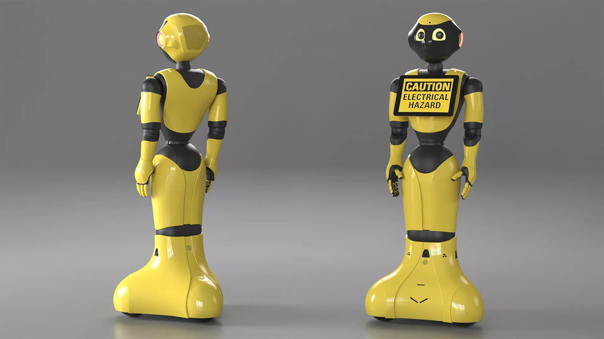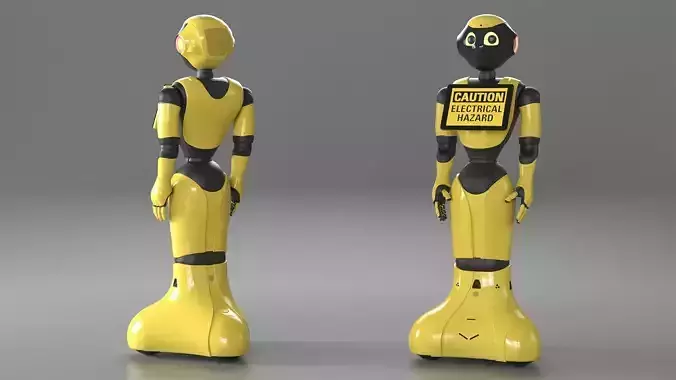 Resident Robot Generic home robotics humanoid with head, body, arms, legs, and information display. Futuristic social humanoid robot with the ability to recognize human faces and emotions. Yellow home robotics humanoid with head, body, arms, legs, and information display. For humanoid shape robots, kid robotics leisure, information robotics devices, robotics industry technologies, high tech concepts, and computer games design.