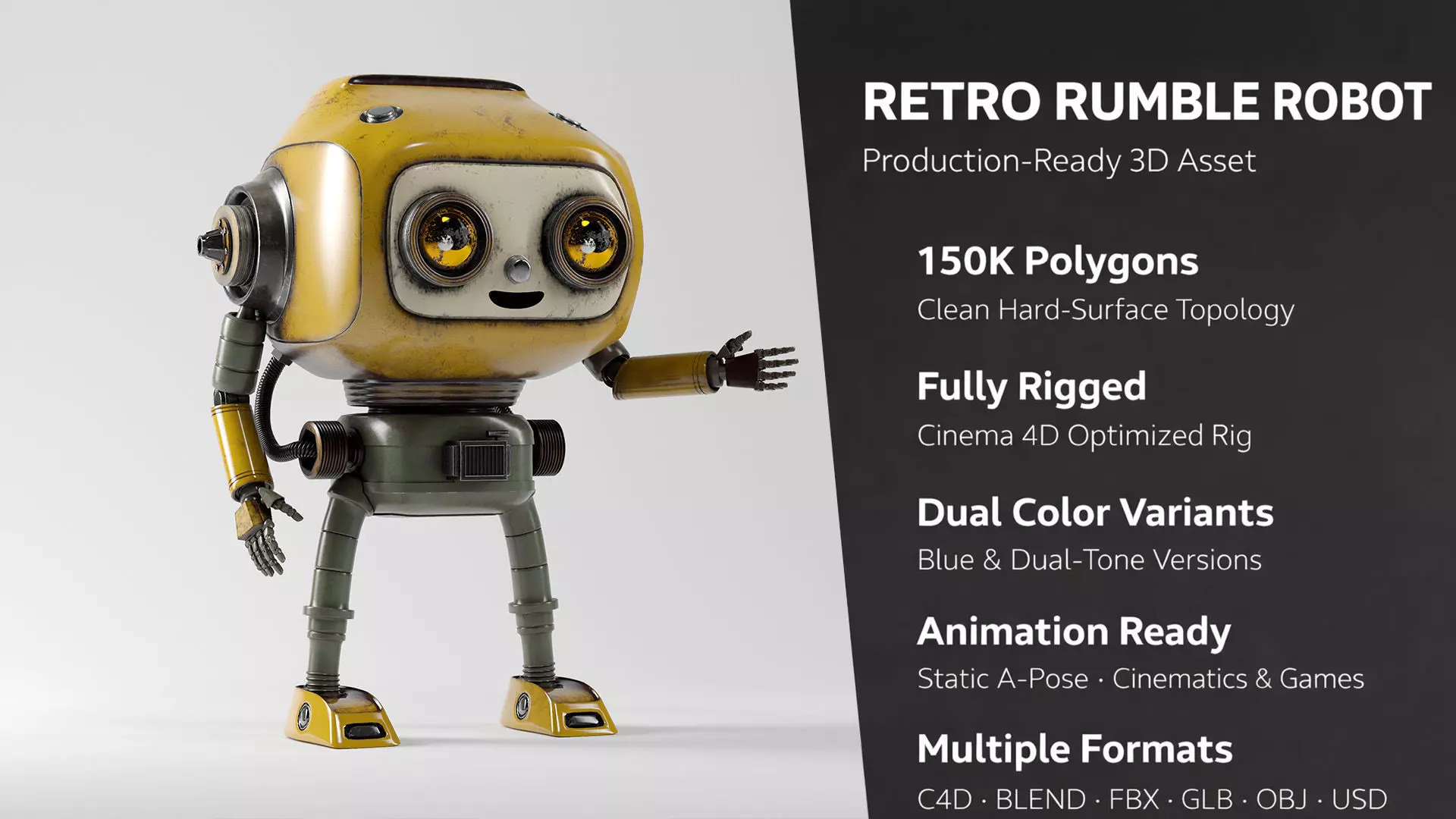 The robot includes a fully optimized rig, suitable for walk cycles, idle poses, and cinematic animations. Rig controllers are fully functional only in Cinema 4D. Other formats include the baked skeleton structure without controller nulls.