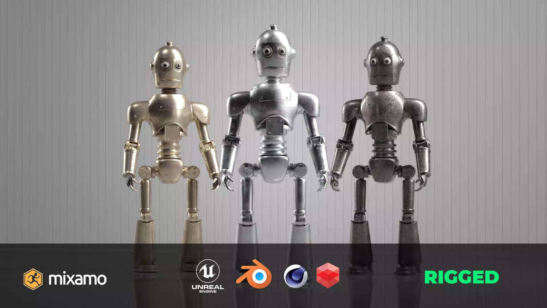 This is a retro-style 3D robot character created in two unique texture versions: a shiny metallic clean style and a slightly rusted vintage look. The model is fully rigged and animated-ready, ideal for game developers, animators, and visual storytelling.