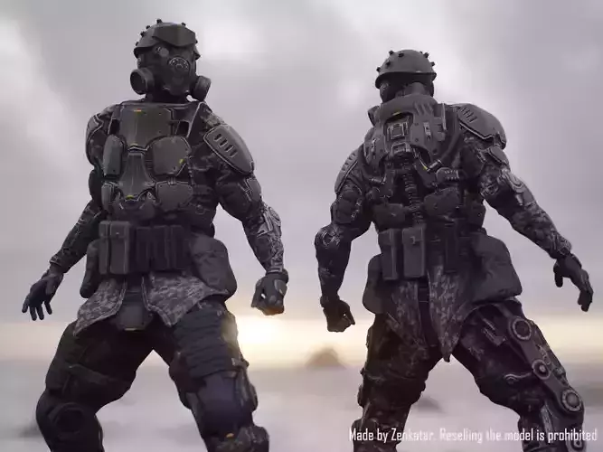 A highly detailed game model of a soldier in heavy armored exoskeleton in a post-apocalyptic science fiction style.