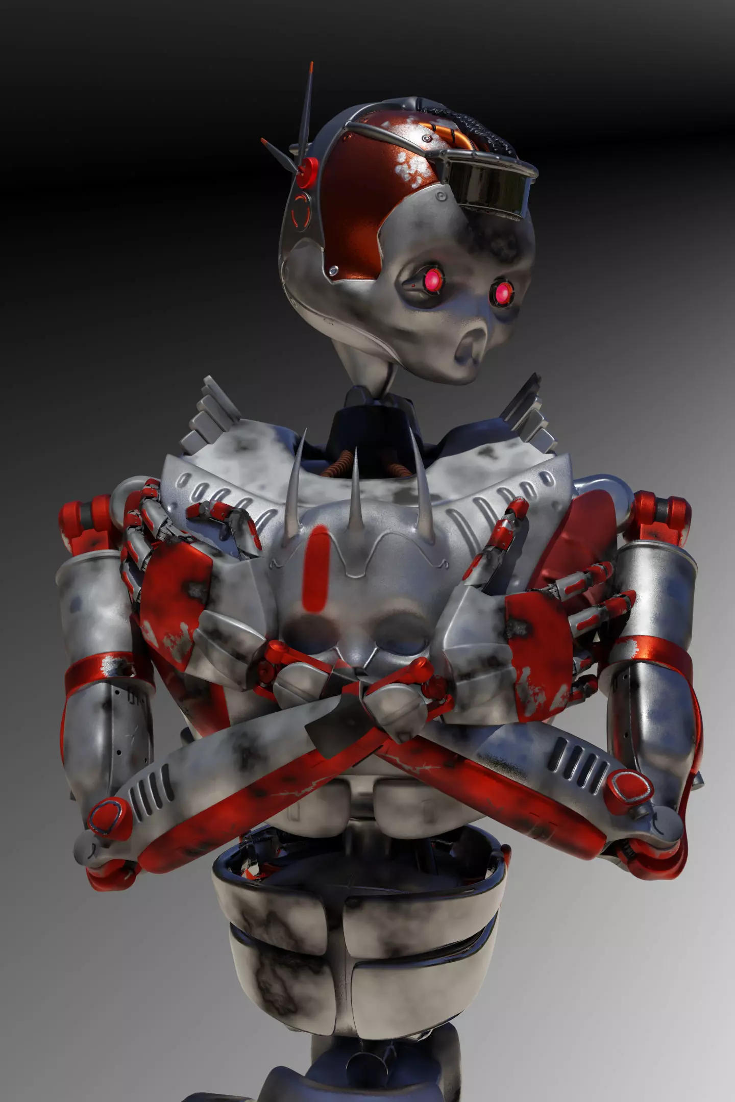 Body consist of separated parts: Head, Torso, Arm, Leg etc. It's riged (native file Blender). Weight of Model LowPoly is about 3MB, High Poly (with smooth) is about 50 MB.Robot have a very similar degrees of freedom like a human. Every part is determined by phisicaly action - basically rotational engine. In Blender file there are switch beetwen FK and IK. Default is FK - it works, IK works with some restriction.