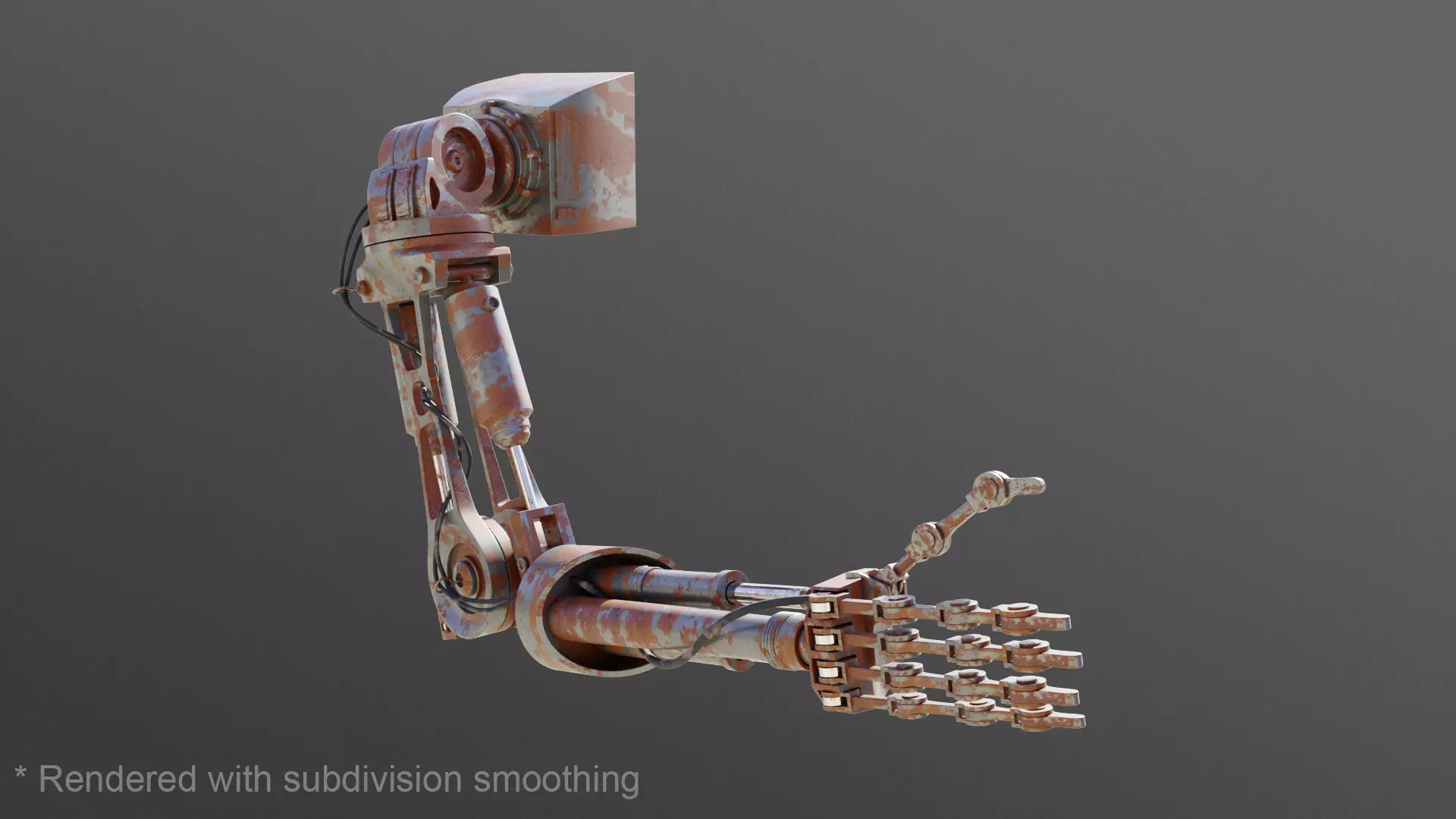 This robotic arm was modelled in Blender 2.8 with extreme care for clean geometry. Textures are high resolution and lower-poly versions of the model are available along with the original creation file.