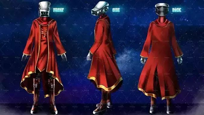 A futuristic humanoid character design combining sci-fi technology with fantasy-inspired fashion. The character wears a long, flowing red robe with elegant gold trim and ornamental detailing, creating a regal and ceremonial appearance. The robe features wide sleeves, layered fabric, and an asymmetrical hemline that adds movement and depth to the silhouette.
