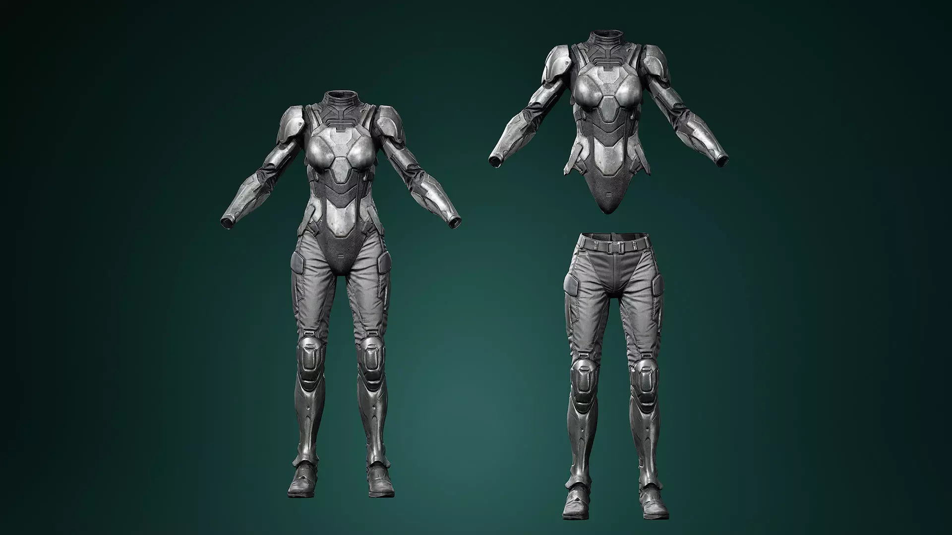 A high-quality sci-fi female armor suit designed for futuristic characters and cinematic production. This outfit combines sleek hard-surface armor with flexible fabric elements, creating a balanced and realistic design suitable for advanced combat environments.