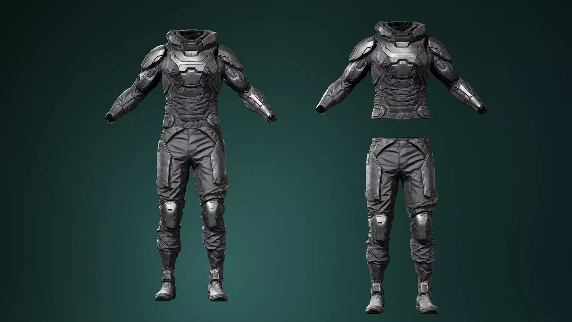 The suit features detailed chest armor, shoulder plates, reinforced arms, tactical pants. The materials include worn metal, durable fabric, and subtle surface damage, adding realism and depth to the asset.