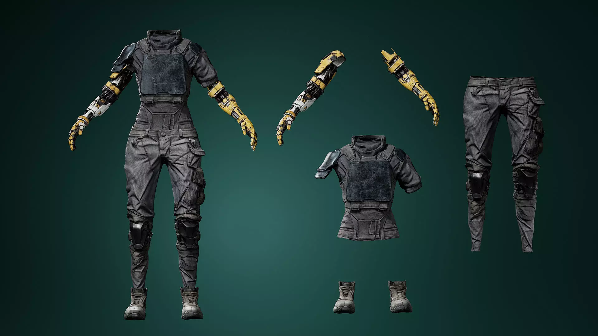 A high-quality sci-fi cyborg outfit designed for futuristic characters, combining tactical clothing with fully mechanical prosthetic arms. This asset is идеально suited for cyberpunk, sci-fi, and dystopian settings, offering a unique blend of human and machine design.