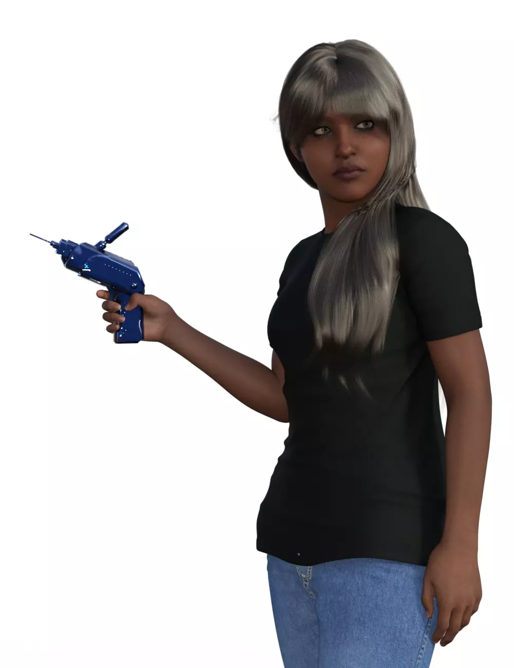 Model of a sci-fi med-injector device designed in Plasticity CAD program with material painting shown in images done in software. Model features a vial port on the dorsal surface, dosing dial and safety on the rear face, and textured grip. Design is a custom build and inspired by scifi concept images and tv series. Model character used for scale in attached images is Daz3D gen9 rigged character and not included in object files. Model is printable or can be used as game or animation asset.
