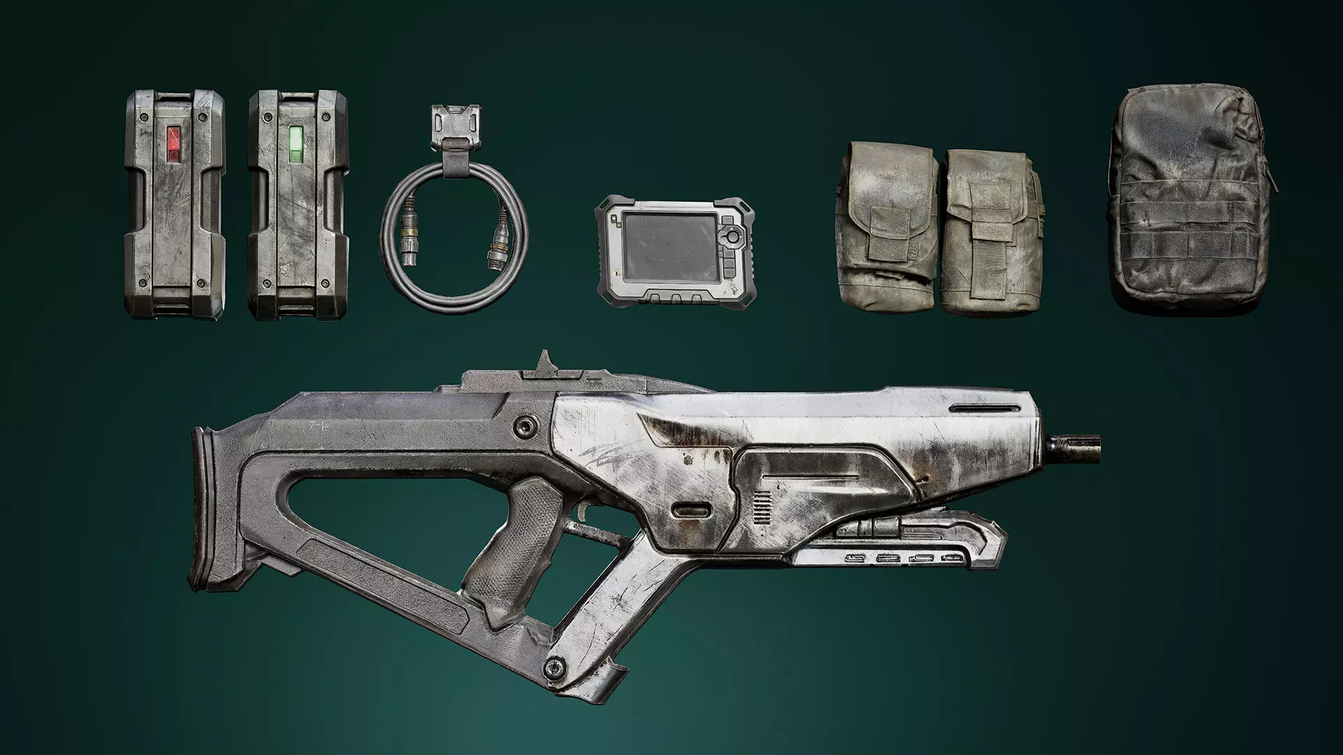 A high-quality sci-fi field gear pack combining a futuristic weapon with essential tactical equipment, designed for games, cinematics, and real-time applications.