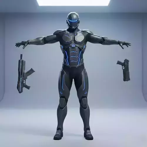 A high-detail 3D futuristic sci-fi soldier designed for action and sci-fi games.The character is a male with an athletic build, presented in T-Pose and front view, full body. He wears advanced combat armor with glowing energy lines and a tactical helmet, giving a high-tech and battle-ready appearance.