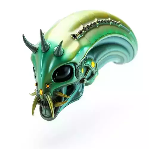 This is a meticulously crafted 3D model of a futuristic alien or insectoid creature head, seamlessly blending organic and mechanical design aesthetics. It features a striking iridescent green metallic finish, large obsidian eyes, menacing mandibles, and subtle glowing yellow accents, suggesting an advanced cybernetic or biomechanical entity. The model boasts high detail and clean, optimized topology, making it ideal for a variety of demanding applications. It is fully UV unwrapped and includes high-quality PBR textures, ensuring realistic material rendering across different environments. This asset is perfect for game developers seeking a unique antagonist or character component for sci-fi, horror, or fantasy games, ready for real-time engines and AR/VR experiences. It is also well-suited for high-resolution cinematic renderings, digital art compositions, and animated projects. The robust mesh is designed to be subdivision-ready, allowing for even greater detail if required, and supports common 3D formats such as GLB, OBJ, STL, ABC, DAE, FBX, USD, and PLY. Its intricate design and striking visual presence will elevate any project.