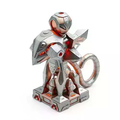 This 3D model depicts a striking futuristic mecha creature, expertly designed with a fusion of metallic silver and copper elements, highlighted by vibrant orange-red glowing accents. The creature features a distinctive, armored head with an alien-like or reptilian aesthetic, complemented by sharp, angular shoulders and a segmented tail. Its body is adorned with intricate geometric patterns, adding a layer of sophisticated detail that makes it stand out.