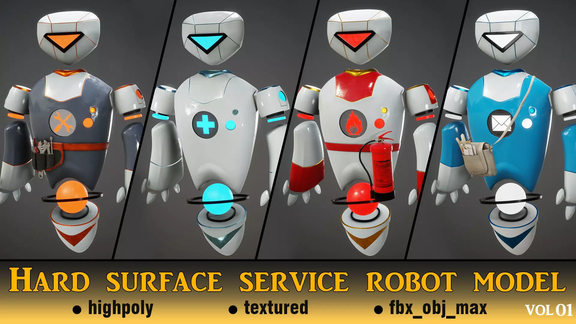 Hello, thank you for choosing my model to see. It makes me proud.This model is from the series of hard surface models, in which there are 4 models of service robots, including nurse, repairman, postman, and fireman.These four models are hyper-modeled and the meshes are neat and clean and quad shapedThe models have neat and clean unwrap without overlappingThe models have their own texture and each robot is separately materializedYou can use these models in your animation or graphic work and enjoyModels in software3 D Max modeled.It has been metallized in Substance Designer software and rendered in Marmoset software.The rendering engine installed on the 3D Max software is V-Ray, and you can open the textures in the V-Ray rendering engine.