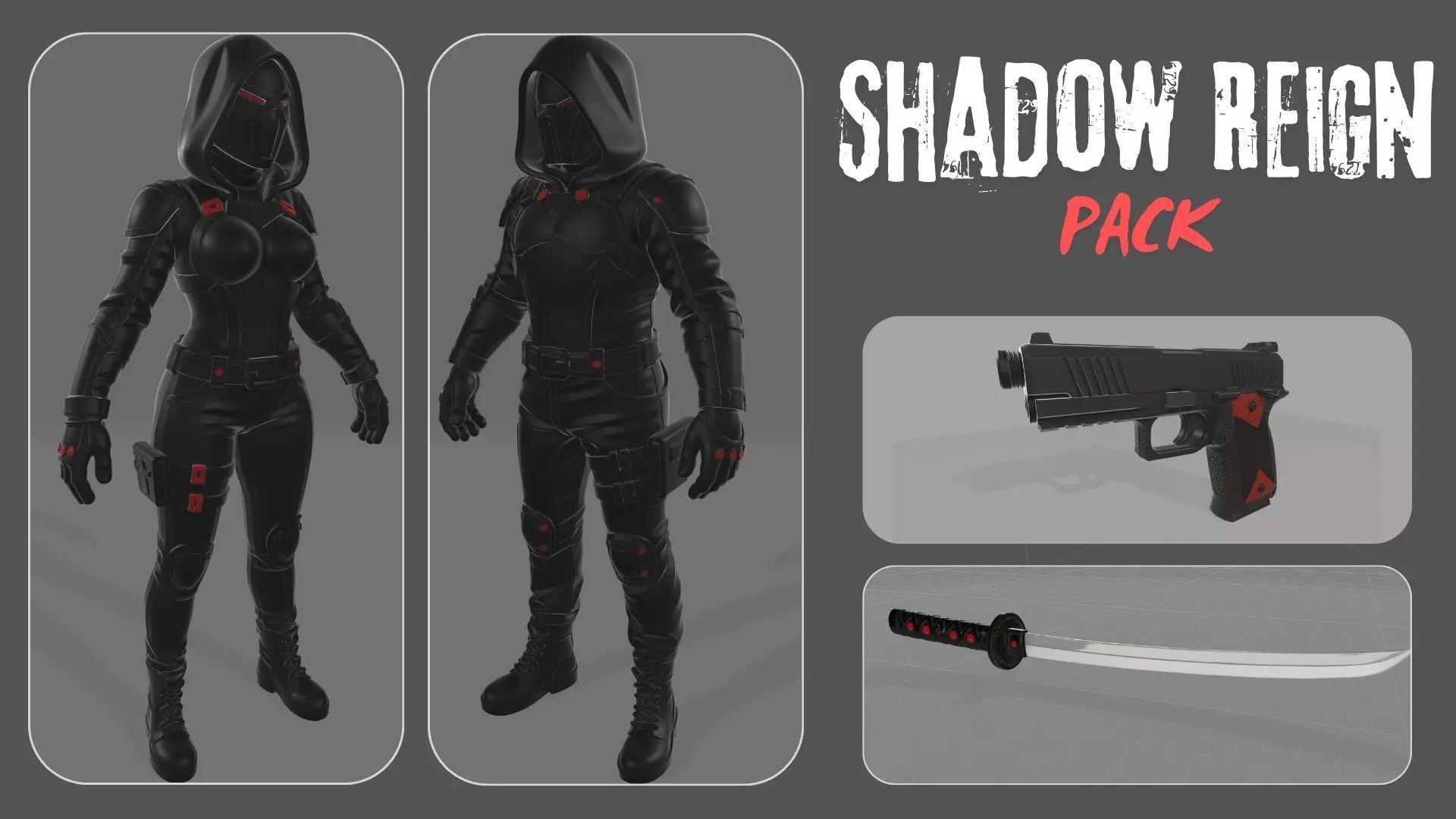 Step into the shadows with the Shadow Reign Pack — a premium 3D asset collection featuring two elite assassin characters, a tactical pistol, and a deadly black-and-red katana.