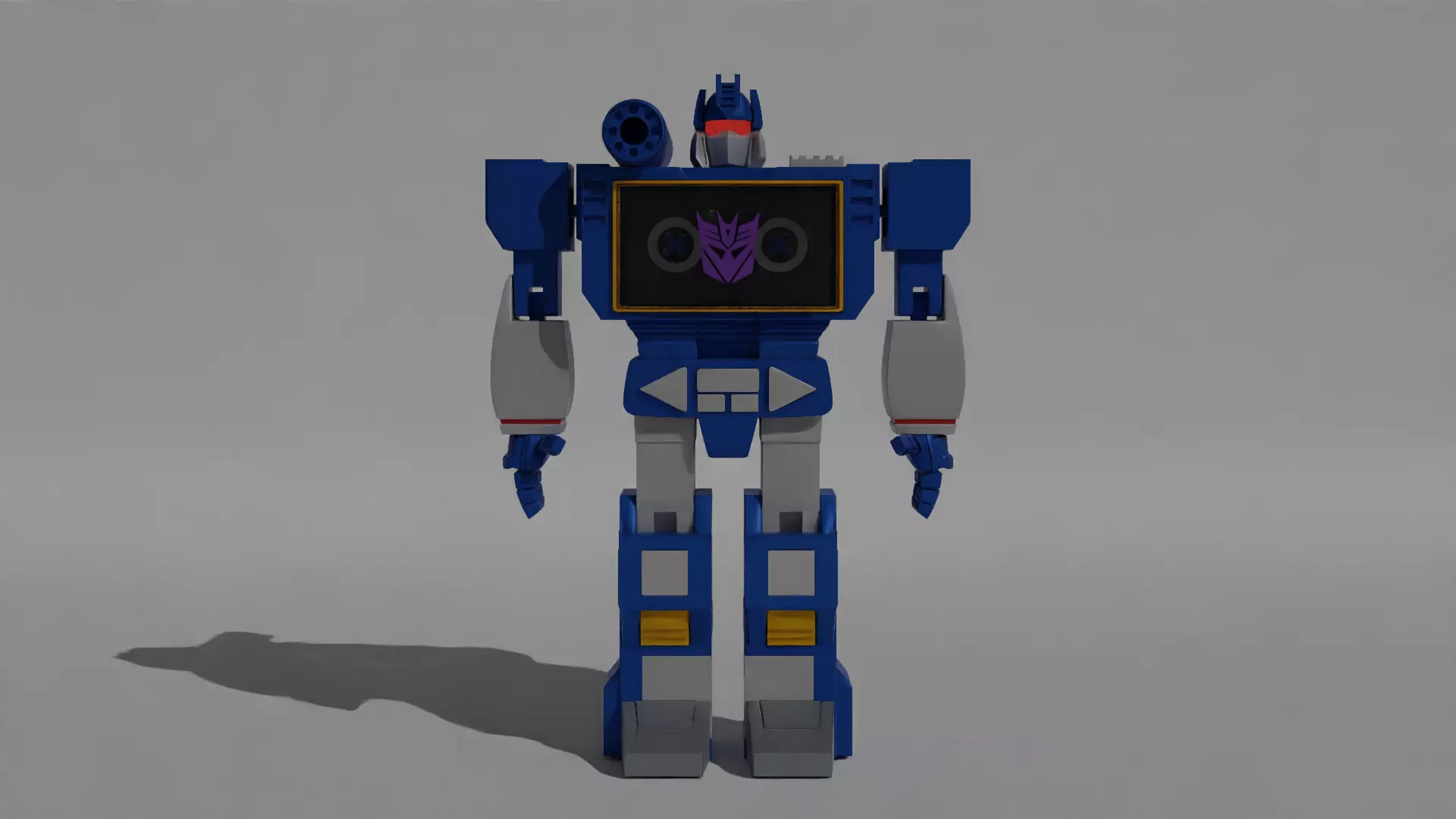 _ ** Soundwave _**English:This Soundwave model is based on the G1 figures of the decepticons with some slight modifications to it. You can use it for animations as well as 3d printing. It does not contain any additional items, other than a video cassette in its compartment, but it does not transform.Note: The stage is included in all available formats, the decepticon logo is just a figure added with textures. it is NOT rigged.