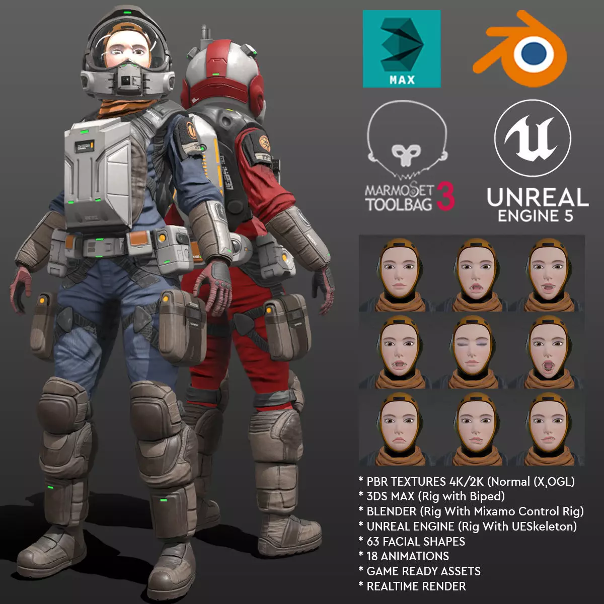 FILE FORMATS3DS Max 2022 - Rigged with biped (support *.bip files) - 35.656 Polygons, 36.544 Vertices - 18 Animations - 63 Morph Channels - With and without Facial Rigs - Arnold Render