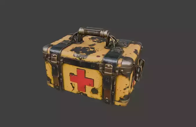 At its core, this first aid kit is a compact, reinforced metal case painted in a worn industrial yellow, instantly readable as an emergency medical container. The iconic red cross emblem is boldly displayed on the front, providing immediate visual clarity even in chaotic or low-light environments. Scratches, chipped paint, oil stains, and weathering marks are carefully distributed across the surface, suggesting years of heavy use and exposure to harsh conditions. These imperfections elevate the model beyond a clean prop, turning it into a believable artifact of a lived-in world.