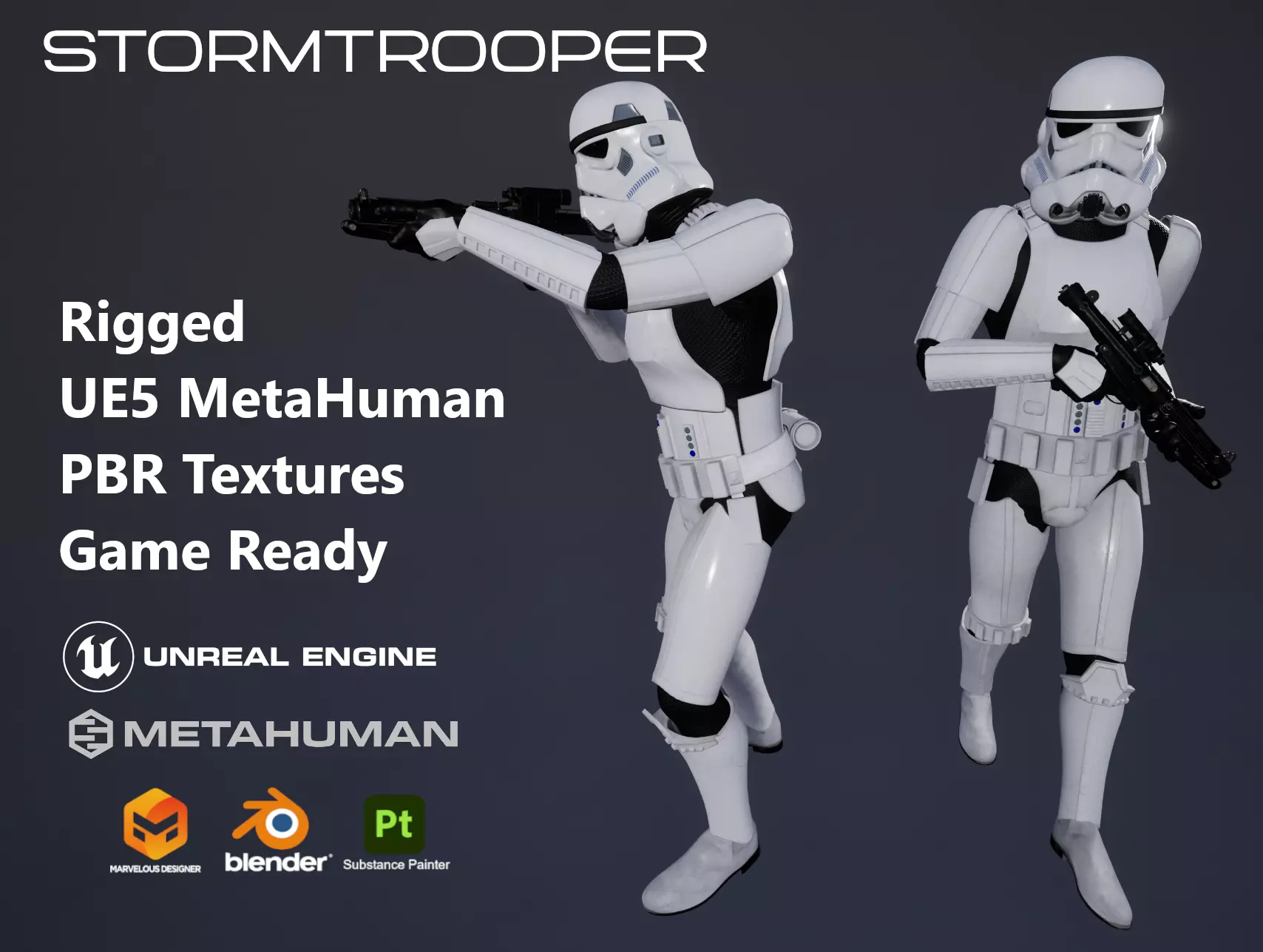 Highly detailed custom made Stormtrooper model. This asset is designed to be used in Unreal Engine game projects. Model is based on original movie reference photos to get as close to screen accurate as possible.