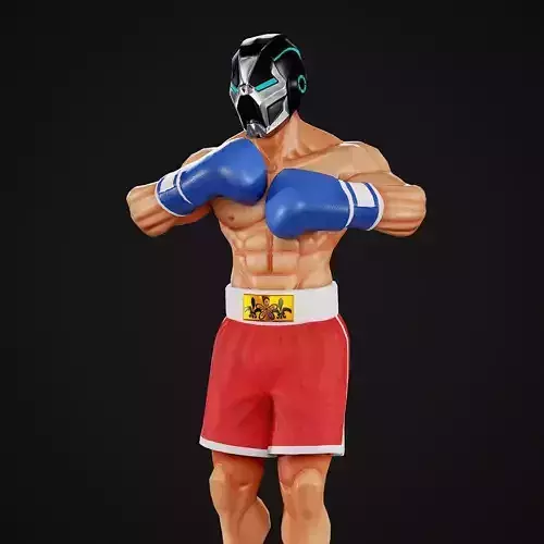 This is a stylized, low-poly, game-ready boxer character designed for real-time applications. The model features a heroic athletic build with exaggerated musculature, optimized for clear silhouette readability in gameplay. A futuristic cyber mask replaces the traditional head, adding a sci-fi twist to a classic boxing archetype and making the character suitable for arcade fighters, mobile games, or stylized action titles.
