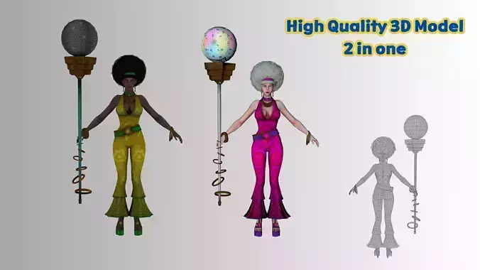 Overview: Bring the dance floor to your game with this high-quality, stylized Disco Queen character. This bundle includes two distinct color versions (Yellow/Green and Pink/Purple variants) with unique afro-textured hair and retro outfits. Perfect for music games, social simulators, or quirky action titles.