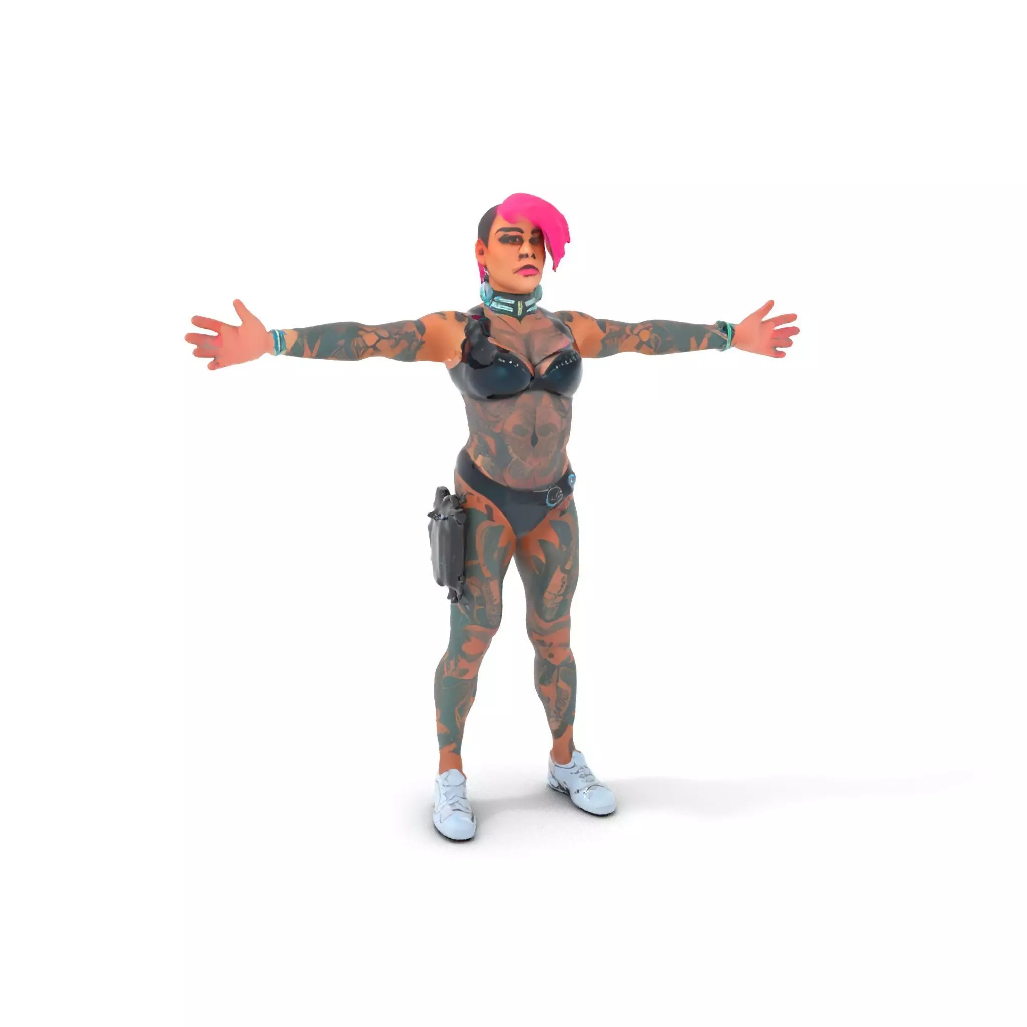 This is a highly detailed 3D model pack of a tattooed cyberpunk character, perfect for futuristic settings and character design. Each model has 3 levels of detail: low-poly (1000 triangles for mobile), middle-poly (10,000 triangles for environment), and high-poly (100,000 triangles), which allows for use in production rendering (such as 3ds Max, Maya, Cinema 4D, Blender, Vray/Corona/Cycles, and others), game engines (Unity and Unreal compatible), and interactive presentations, providing a choice of detail based on the LOD System principle.