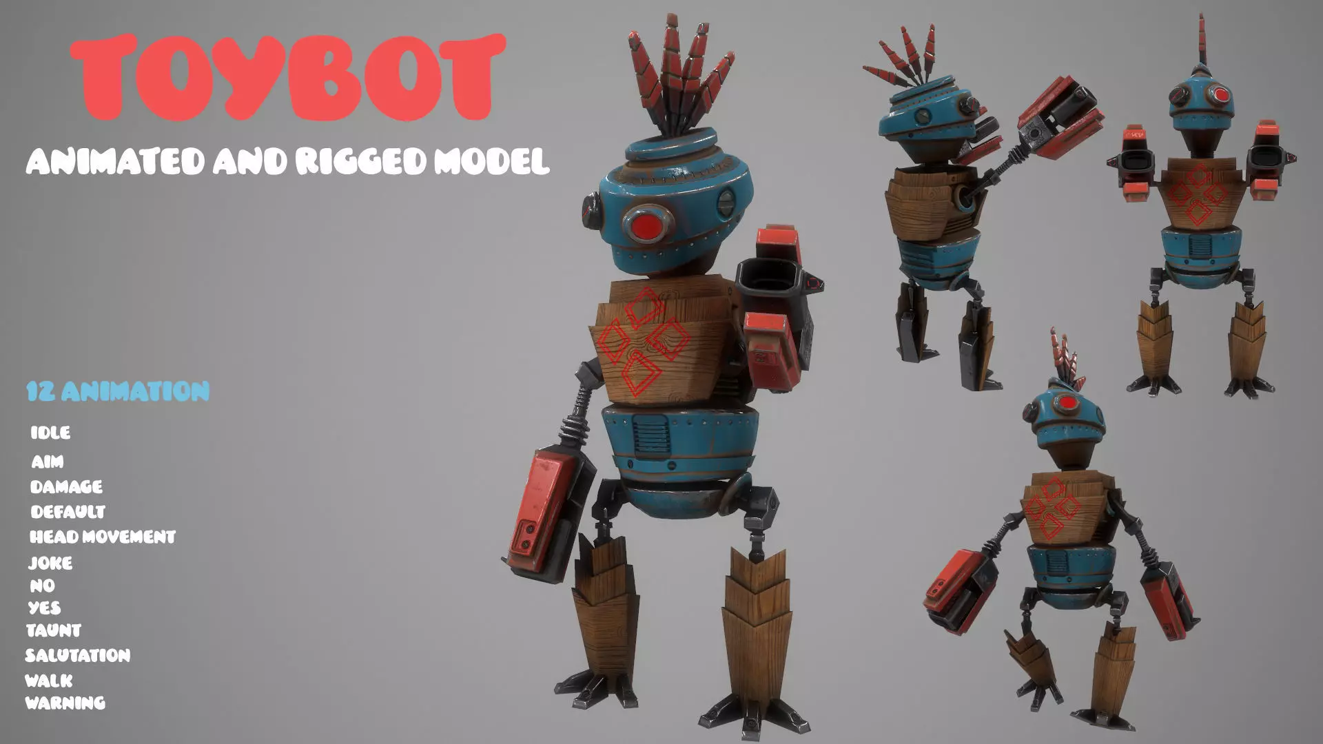low-poly game ready 3d model. Rigged and animated toybot character.