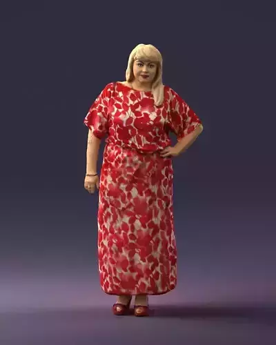A confident woman captured in a natural standing pose, wearing a luxury red floral maxi dress and matching shoes. Fine garment folds, natural proportions, and authentic silhouette make this asset ideal for creative or professional projects requiring realistic human characters, especially modern lifestyle, street, and interior scenes where realism matters.