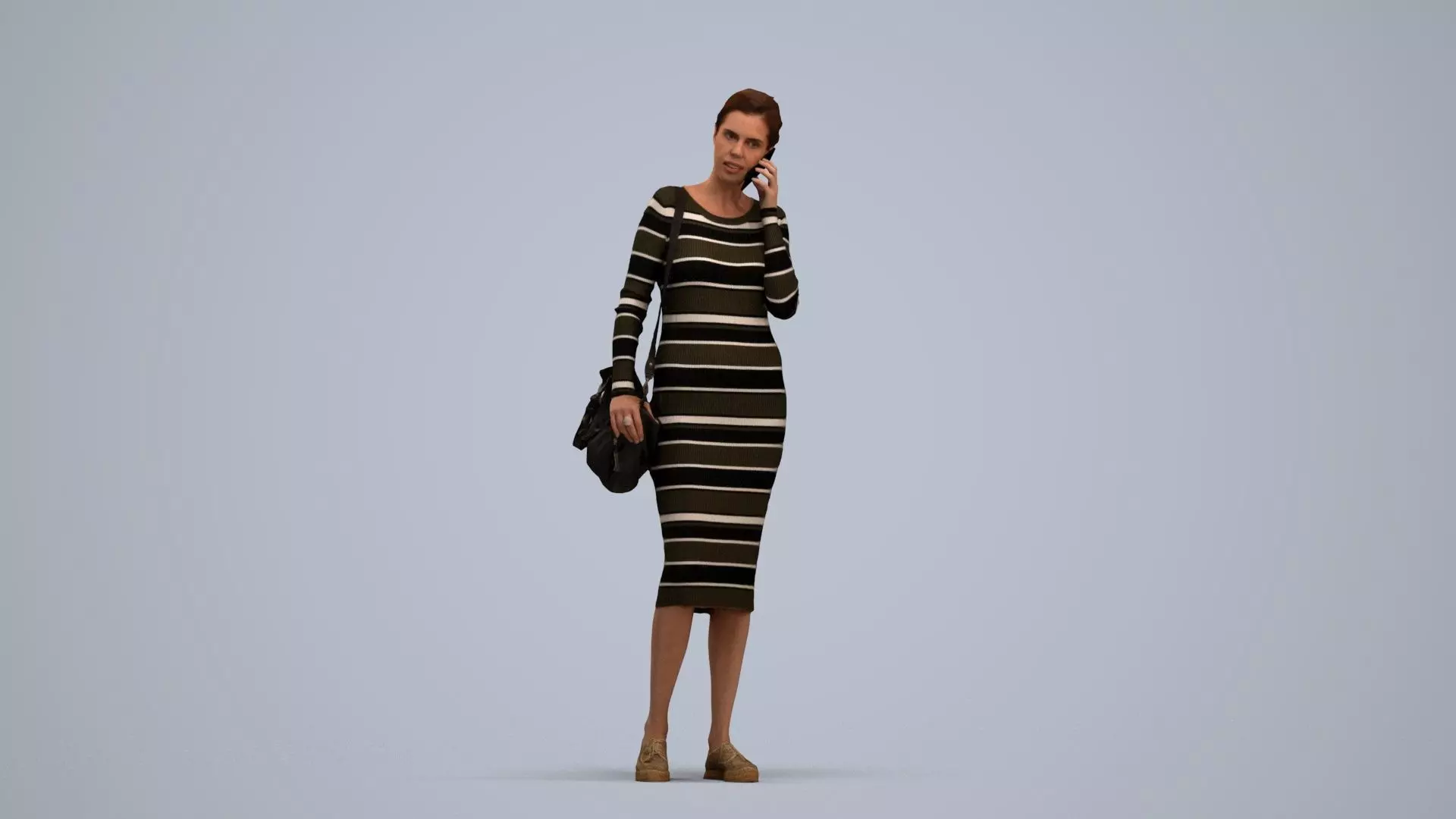 a woman in a striped dress talking on a cell