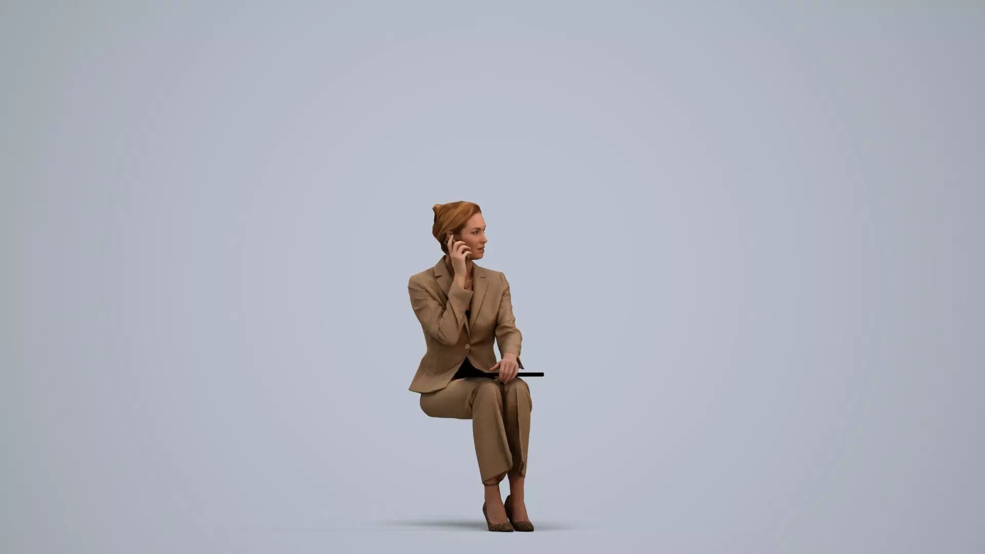 a woman in a business suit sitting on a cube