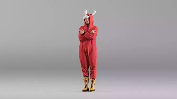This 3D scanned model features a young person wearing a whimsical red animal onesie with a hood shaped like a cartoon reindeer or fantasy creature. The character’s relaxed stance and humorous outfit make this model perfect for creative or professional projects requiring realistic human characters with a playful, casual, or festive twist.