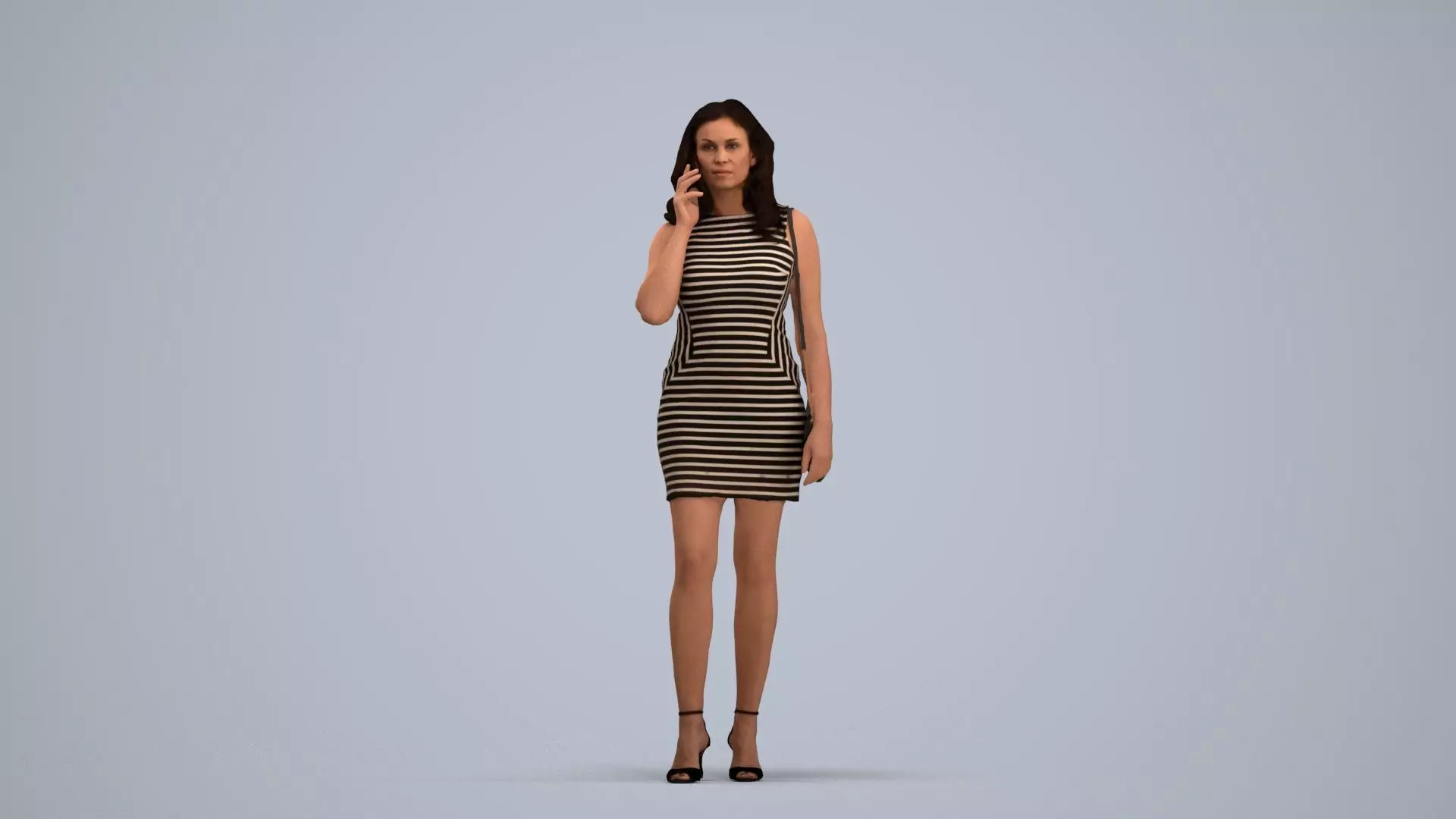 a woman in a blackwhite striped dress