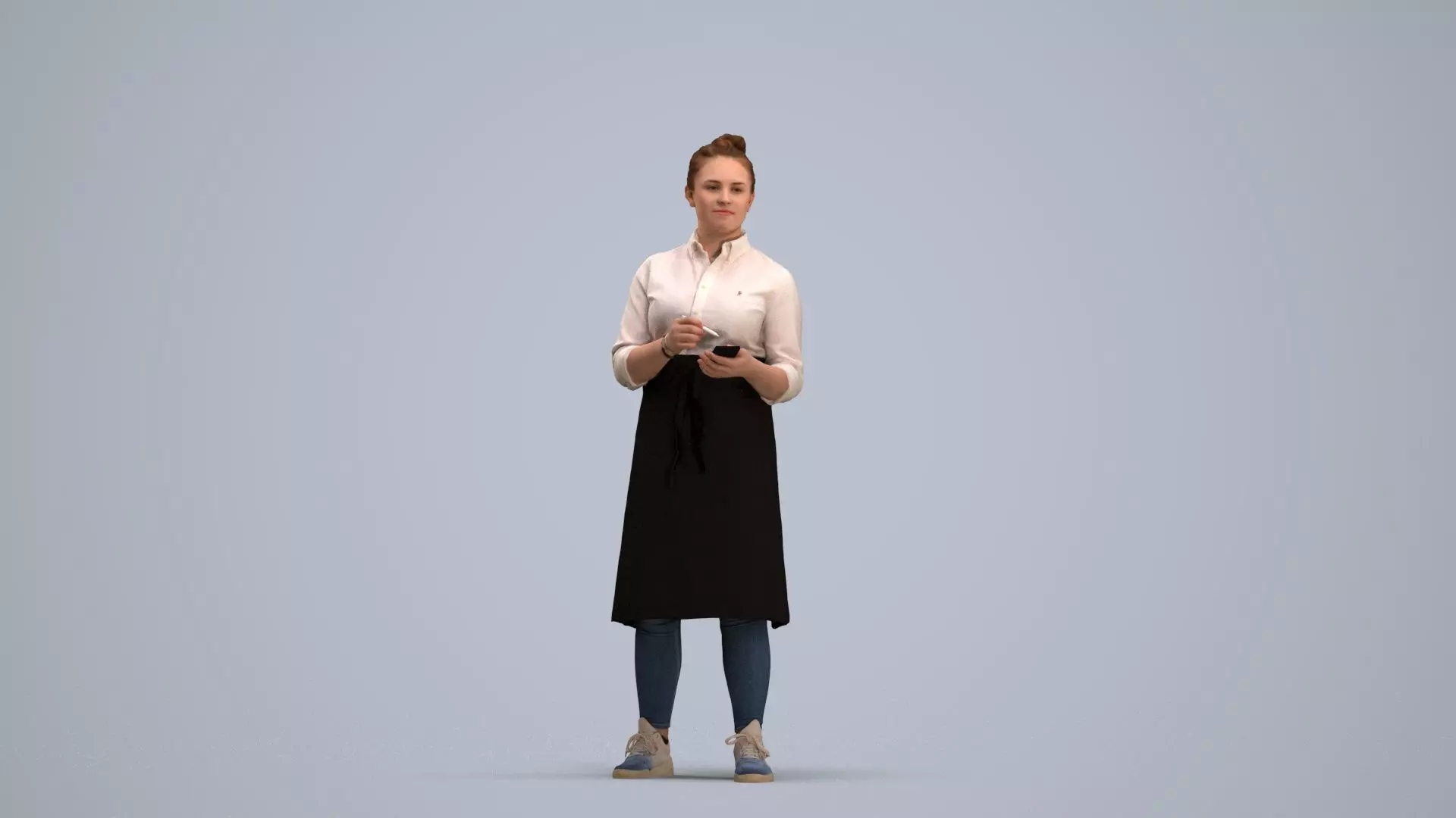 a woman in a black apron holding a knife