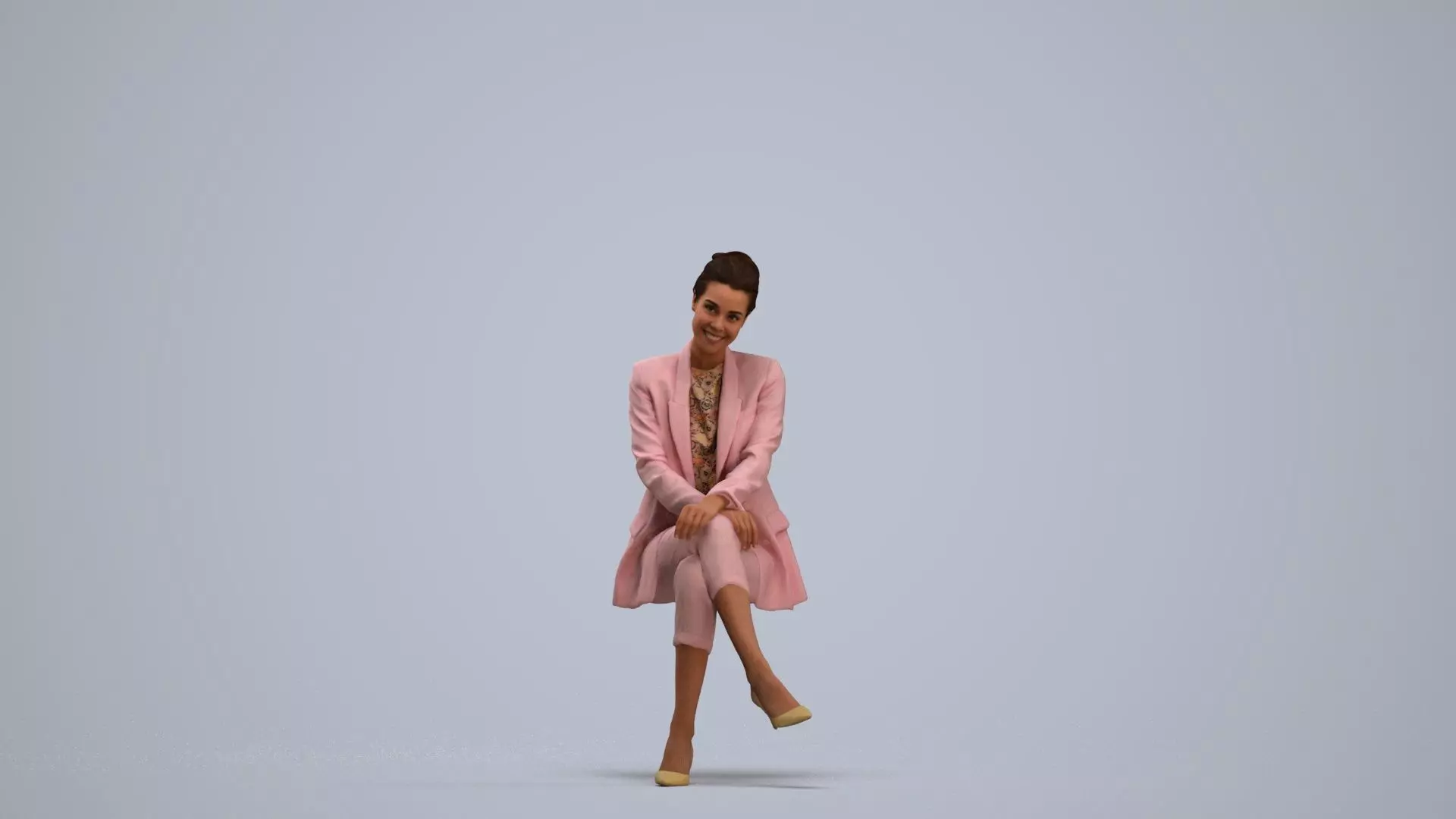 a woman in a pink suit sitting on a stool