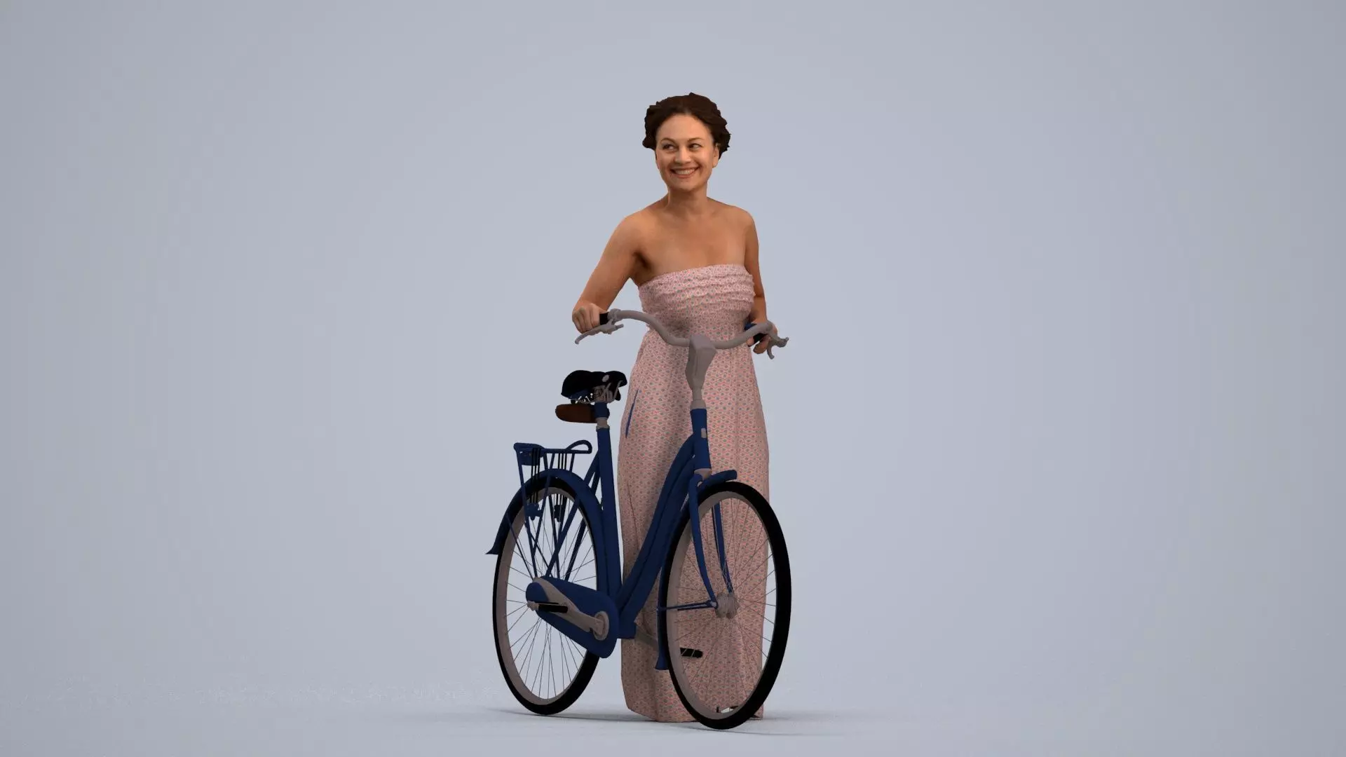 a woman next to a blue bicycle