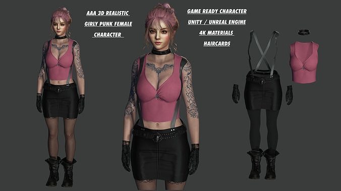 3D AAA Realistic Pinky Biker Female Character - Biker Girl Low-poly 3D model