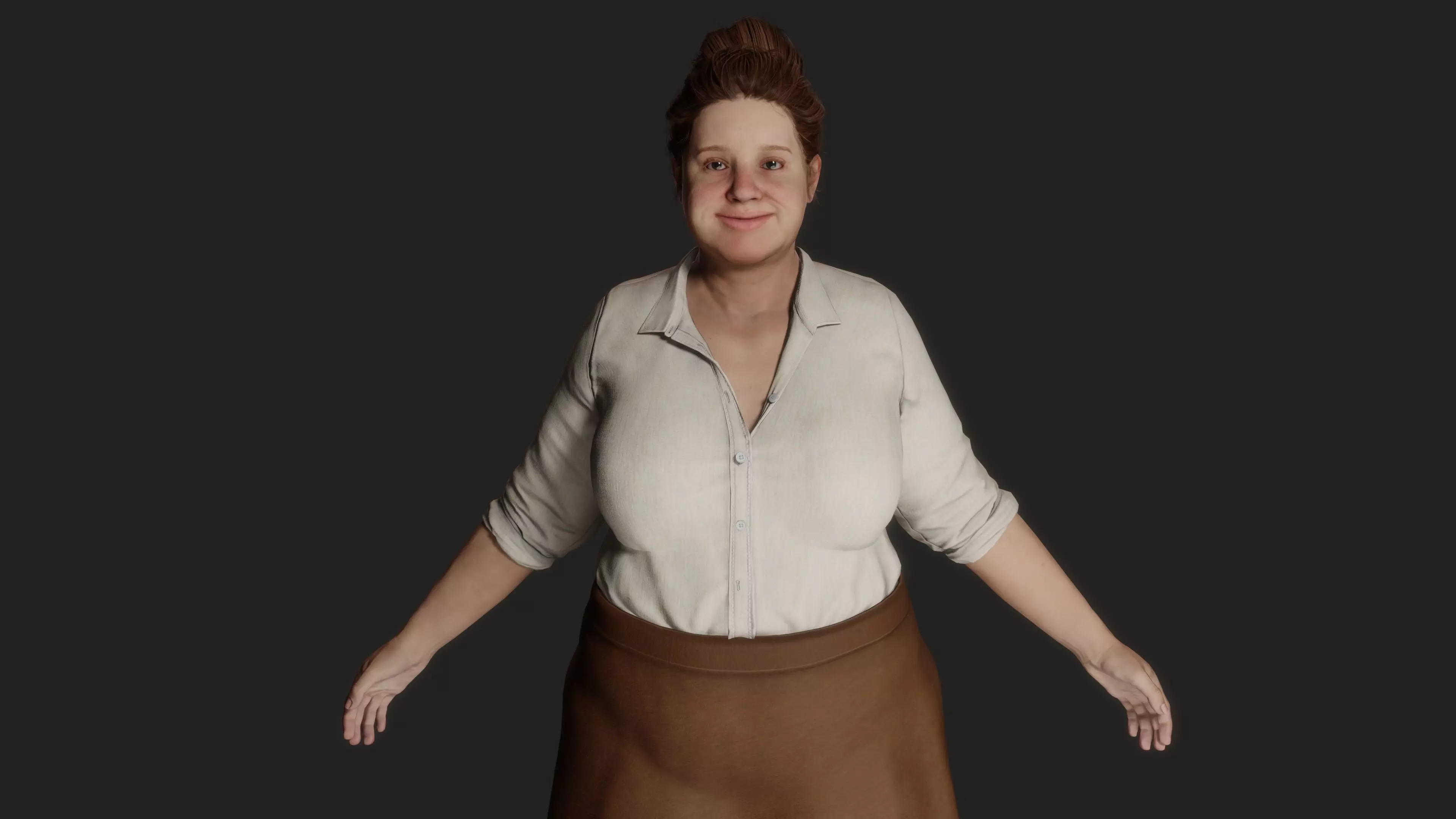 The character is characterized by her warm and welcoming demeanor, accentuated by a wide, sweet smile that brings out the genuine happiness in her eyes. Her brown hair is elegantly tied up in a neat bun, adding a touch of sophistication to her overall appearance. The choice of a brown wide skirt, gracefully reaching the knees, complements her curves and showcases a tasteful sense of style. Paired with the skirt is a classic white blouse, its sleeves casually rolled up to the elbows, suggesting a relaxed yet chic fashion sense.