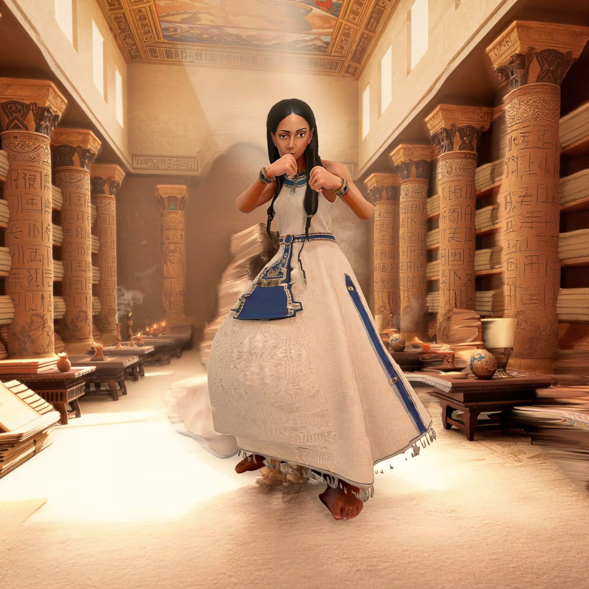 A poised 42-year-old female Egyptian scribe with a slender build, long black hair in tight braids adorned with gold beads, stands in a sunlit ancient temple scriptorium wearing a white linen kalasiris edged in cobalt blue and a bronze ankh necklace, her face calm and focused. Papyrus rolls cascade from reed shelves, hieroglyph-carved sandstone pillars rise amid flickering oil lamps, incense smoke curls through shafts of golden light, scattered ink pots and ivory styluses dot low ebony tables under a vaulted ceiling painted with vibrant gods.. White background. Realistic colorized model. In the middle. Full body view. T POSE with arms spread to the sides, straight arms, front view. Professional lighting. Soft shadows. Include the described environment and all visual details for a complete scene.Included animation of Idle, Walking, Running etc. It's full compatible with Mixamo RIG.