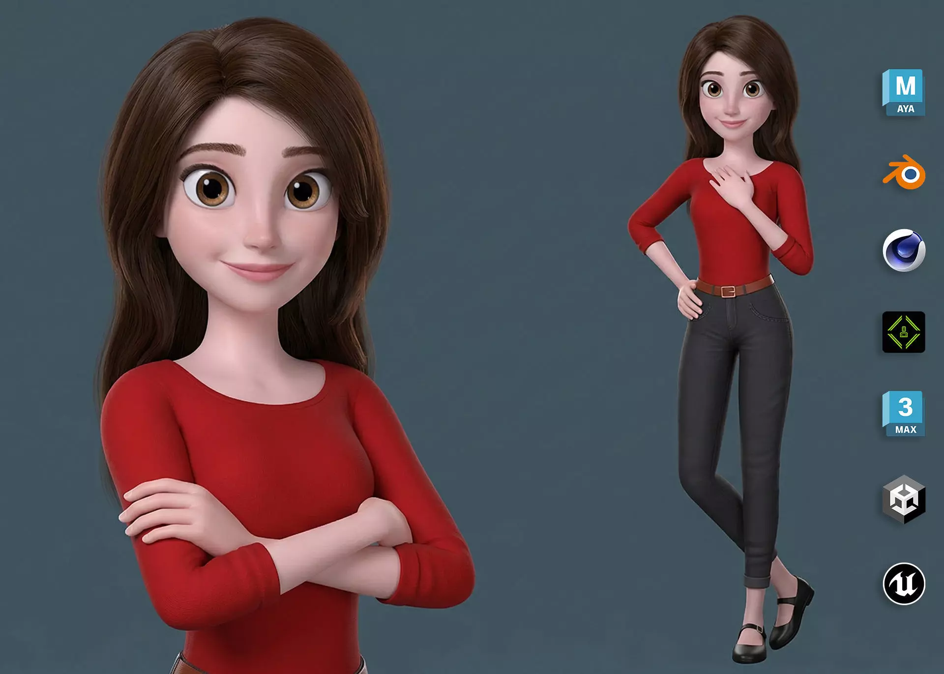 Get 3D best quality 3D stylized Girl cartoon character that is full body and face rig.This 3D stylized Girl character rig support most of the popular 3D software like Blender, Maya, 3ds Max, Cinema 4D, Unity, Unreal Engine, Character Creator or CC Fbx and iClone.